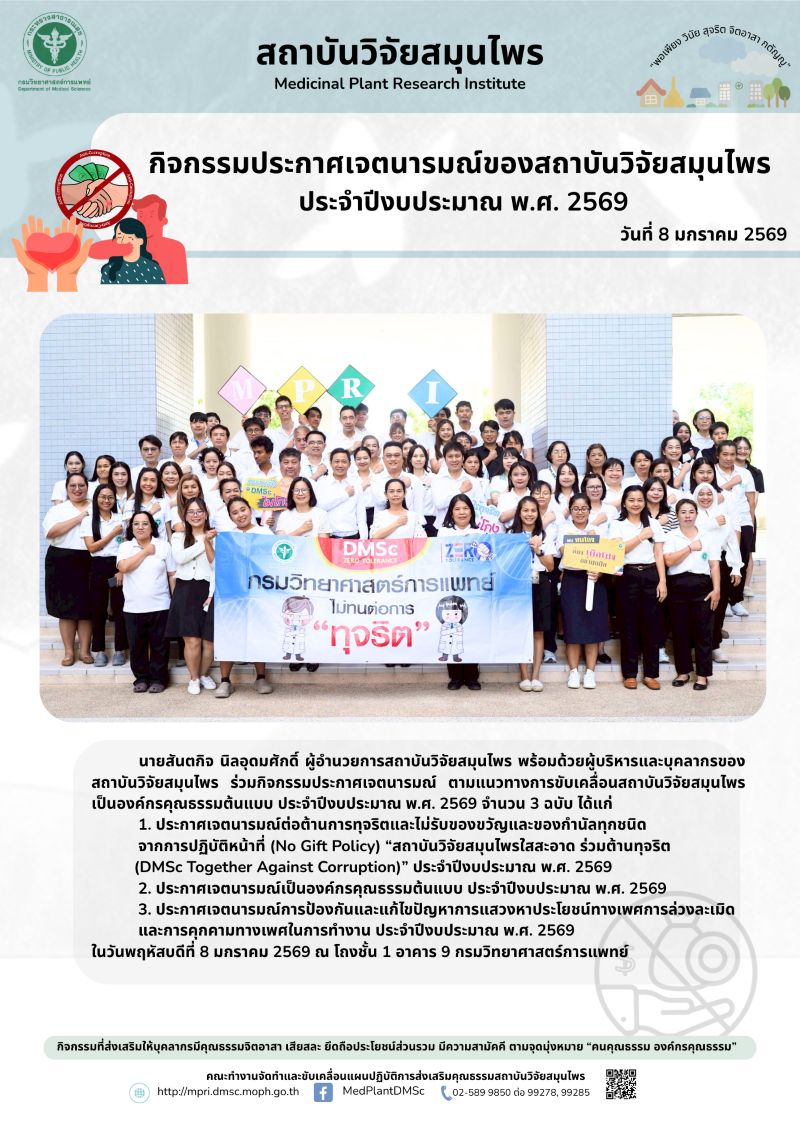 • รายงานกิจกรรมสถาบันวิจัยสมุนไพรเปลี่ยนแปลงสู่สังคมไม่ทนต่อการทุจริต ประจำปีงบประมาณ พ.ศ. 2569